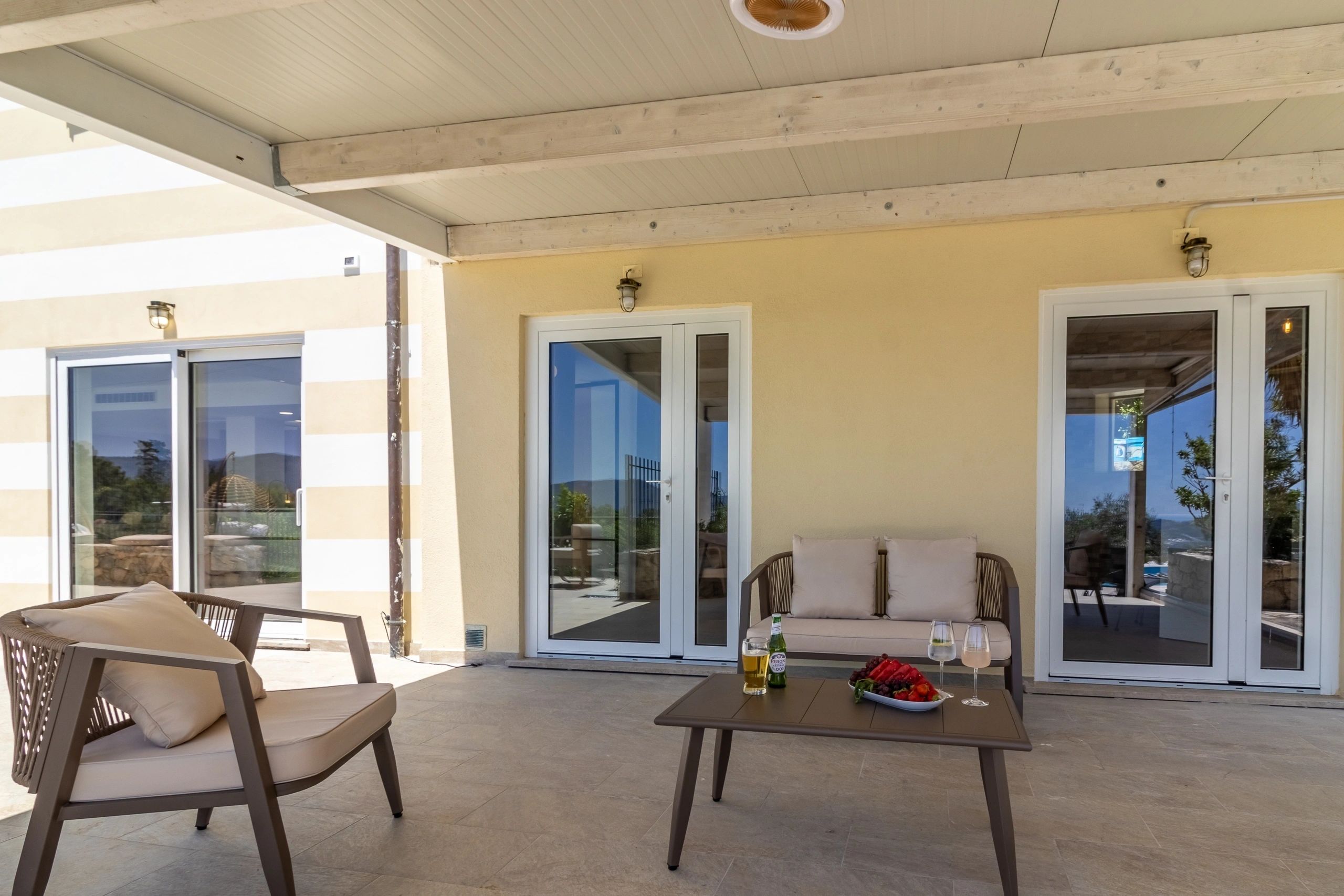 Villa Amaranta invites you to relax and enjoy every moment in its thoughtfully designed outdoor spaces. A spacious covered terrace features a large teak lounge area, plenty of sun loungers, and a generous round dining table perfect for al fresco meals. The dedicated barbecue area makes it easy to gather with family and friends for outdoor cooking and dining with spectacular sea views.